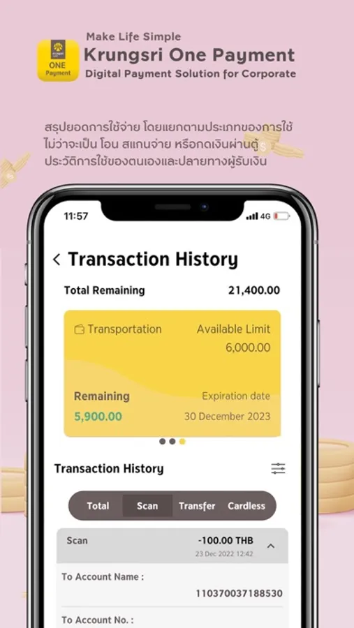 - ตรวจสอบประวัติการทำรายการย้อนหลังได้ทันที โดยสรุปยอดการใช้จ่าย แยกตามประเภทของการใช้งาน ไม่ว่าจะเป็น โอน สแกนจ่าย หรือกดเงินสดผ่านตู้"