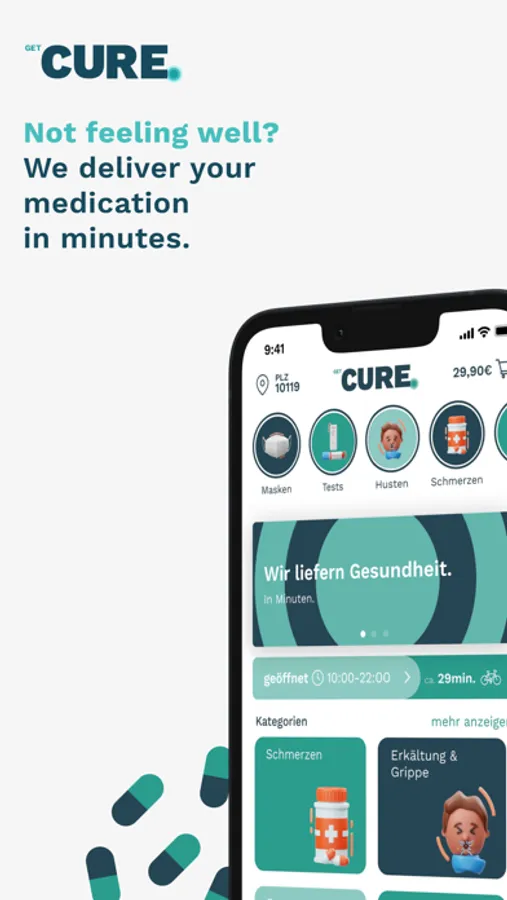 To do this, CURE works together with local pharmacies. Download the app, enter your zip code, and select your needed products - and we deliver in minutes, from A for aspirin to Z for zinc. Or use the search and find exactly what you need.
