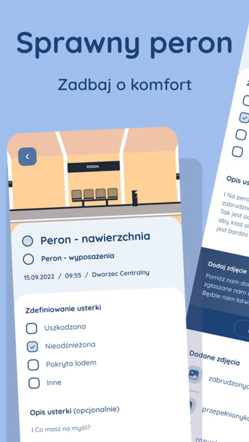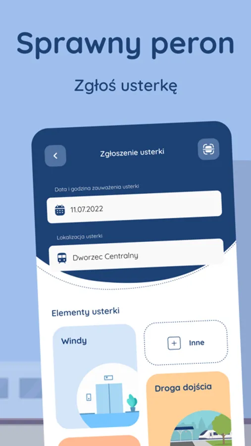 Aplikacja Sprawny peron to narzędzie, które umożliwia zgłaszanie usterek związanych z peronami i drogami dojścia na stacjach i przystankach kolejowych. Dzięki niej osoby podróżujące koleją mogą szybko i łatwo zgłosić nieprawidłowości, które negatywnie wpływają na komfort podróży lub stanowią zagrożenie dla bezpieczeństwa podróżnych. Aplikacja umożliwia zgłoszenie usterki za pomocą zdjęcia lub opisu.