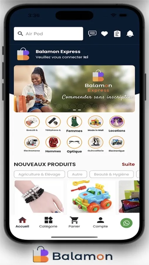Grâce à l'inscription simple et complète. Balamon Express respect le goût du malien en matière de vente en ligne, très simple, avec paiement à la livraison. Sa force se trouve dans ce que vous cherchez; si vous ne trouvez rien, pas de panique, on le cherche dans notre réseau de commerçants, puis vous l'envoie . Sa qualité se trouve dans la rapidité et l'efficacité de la livraison.