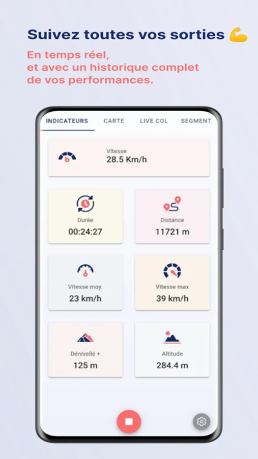 Avoir en temps réel pendant l'activité différents indicateurs pour le suivi cyclisme GPS (compteur vitesse, compteur distance km, vitesse max, vitesse moyenne, cardio, durée ..).