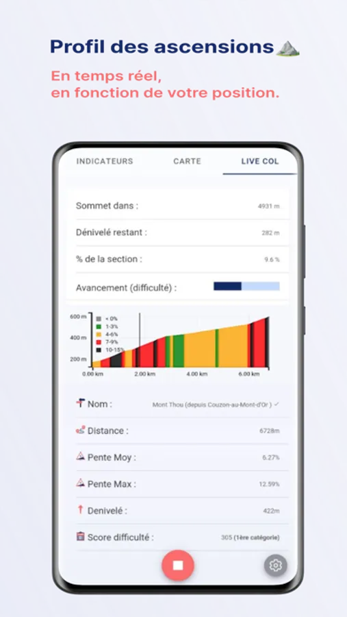 Et à l’approche d’un col, lorsque vous avez chargé un itinéraire le profil s’affiche en temps en réel et vous indique ensuite ou vous vous situez dans l’ascension.
