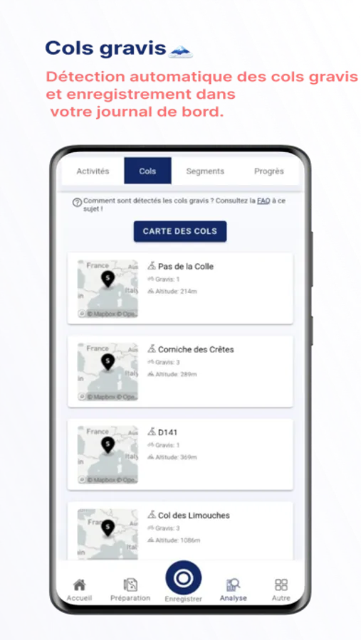 Pour les grimpeurs, à la fin de l'enregistrement GPS de l'activité une analyse est effectuée qui permet de détecter automatiquement les ascensions et cols effectués lors de votre sortie, avec les temps et toutes les informations sur l'ascension (compteur distance en km, dénivelé moyen, dénivelé max, hauteur du col, temps, difficulté, lieu, profil du col par tranche de 100m..).