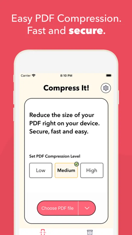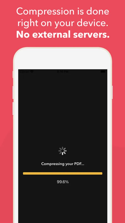 Every PDF compression is done right on your device. That means all PDF files are securely stored on your device and the compression is done in seconds (As it should be!)