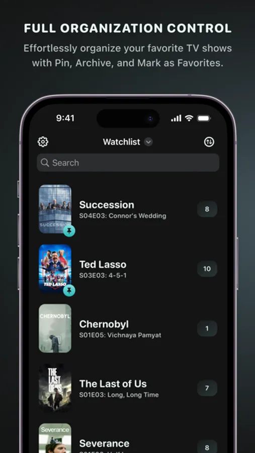 Effortlessly organize your favorite TV shows with. Pin, archive, and mark shows as favorites.