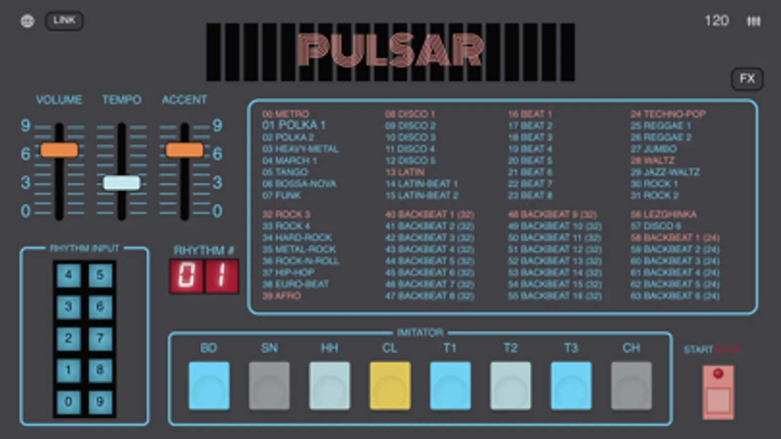 The "Imitator" has 8 pads for recalling 8 drum sounds (bass drum, snare, hat, clap, 3 toms, crash). It also allows you to improvise and play over the embedded rhythm presets.