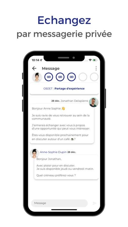 Échangez facilement avec les membres de la communauté, besoin d’un coup de main, collaboration sur un projet commun, et plein d’autres sujets sur lesquels vous pourrez échanger en privé avec les personnes du réseau !