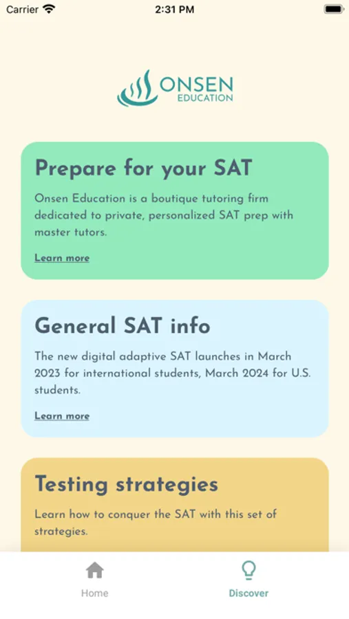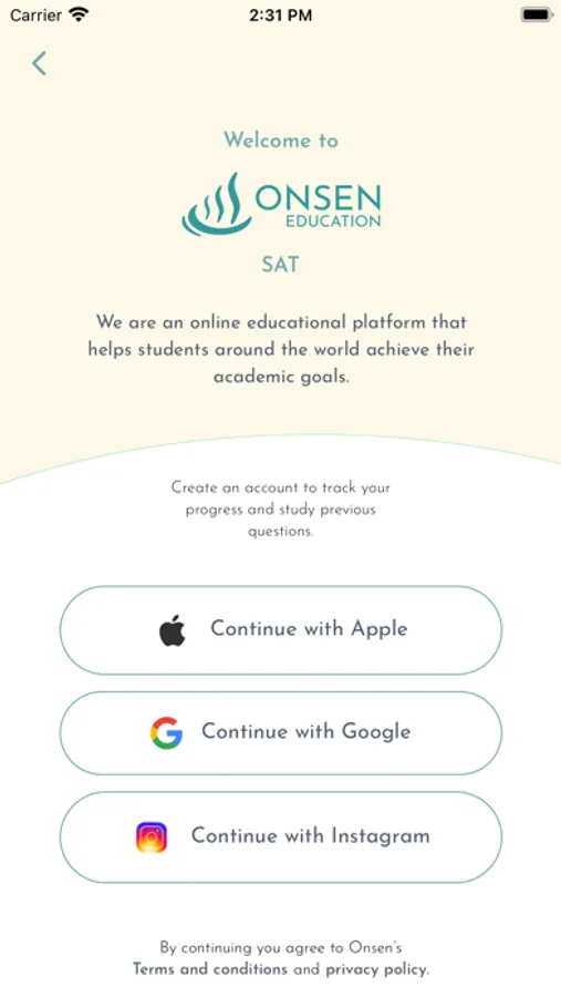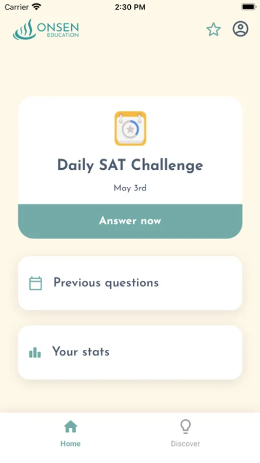 Onsen SAT helps students see steady, significant improvement on the new digital SAT with daily targeted practice in a fun, intuitive app. Students answer a new SAT Reading & Writing or Math question every day and receive feedback on their answer choices. Students can also track their daily stats and view previous questions to fine-tune their SAT skills as test day approaches.