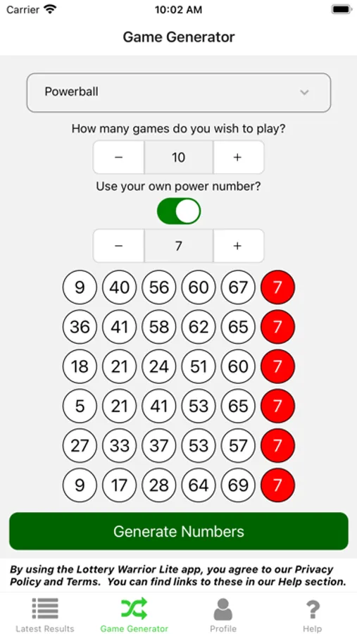 Lottery Warrior Lite is a FREE and great way to generate game numbers for Powerball, MEGA Millions, Lotto America, Lucky for Life, and Cash for Life, and you can also check the latest lottery drawing results, all from the convenience of your iPhone or iPad. Lottery experts say you should never use the auto-generate tickets from the stores you purchase lottery tickets. We created Lottery Warrior Lite to help you avoid this pitfall, and to have more control over the numbers you use when playing your favorite lottery, whether it be Powerball or MEGA Millions. Let us help you improve your odds of winning! Good luck and enjoy using Lottery Warrior Lite today!
