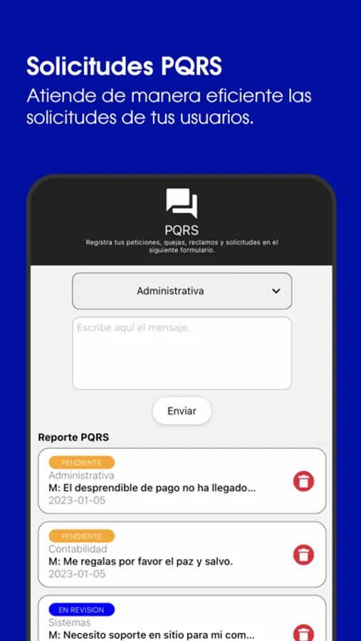 Solicitudes PQRS: tus usuarios podrán contactar fácilmente a las diferentes áreas de la organización o institución educativa, con esto tu personal puede atenderlas por correo electrónico, el administrador gestiona el estado de cada solicitud realizada.