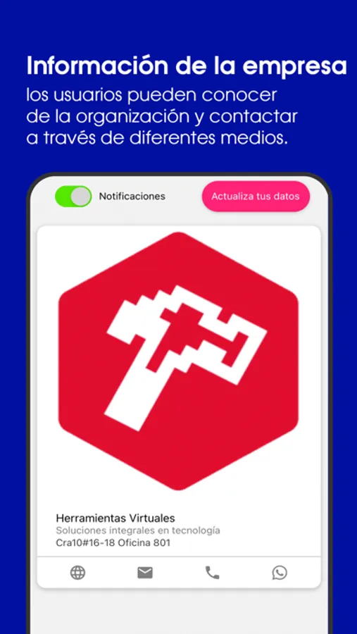Información de la organización: en este ítem los usuarios pueden conocer de la organización y contactar con la misma a través de diferentes medios (Teléfono, WhatsApp, Correo electrónico).