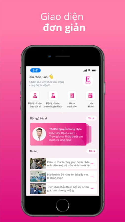 Ứng dụng Bệnh viện E giúp người dùng chủ động đặt lịch khám trước tại Bệnh viện E - Địa chỉ: 89 Trần Cung - Nghĩa Tân - Cầu Giấy - Hà Nội. Khi đặt lịch trước, người dùng sẽ được tiếp đón ưu tiên khi đến cơ sở y tế khám bệnh. Các tính năng chính của ứng dụng: