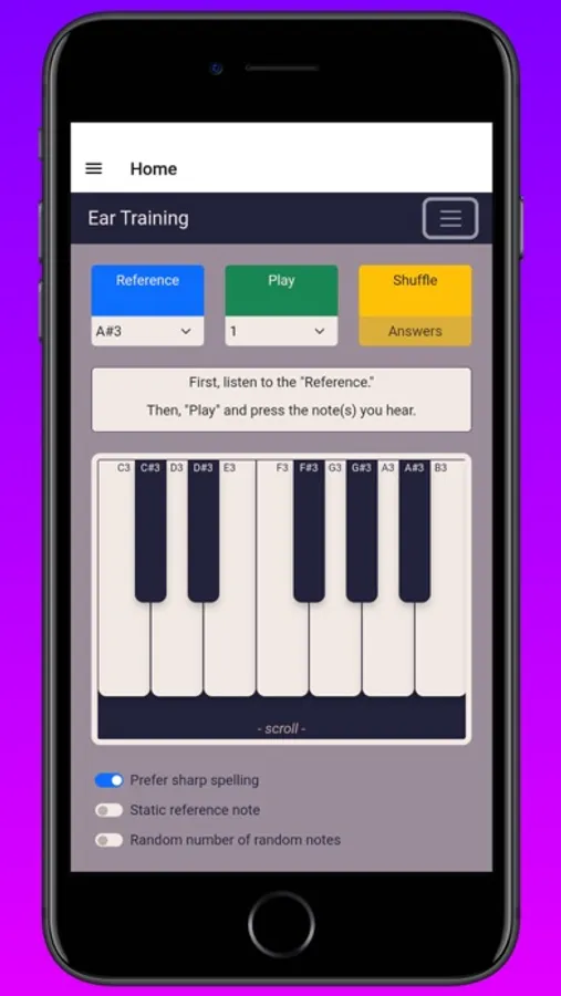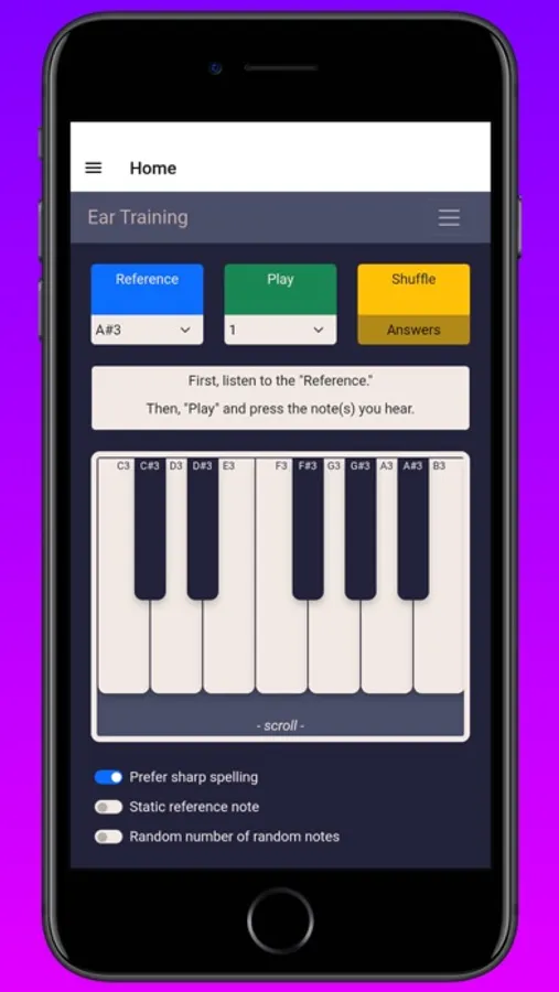 Ear Training - Music Skills is an app that helps users develop their musical skills by challenging them to identify musical notes by ear. The app has a Train page where users can listen to a reference note and then play their guesses on an on-screen piano. The app will play one to five random notes, depending on the user's selection, and the user must match their guesses to the reference note. If the user gets the answer right, they can press Shuffle, to get a new set of notes. If the challenge is too difficult, the user can press Answers to reveal the correct notes. The app also has a switch to toggle between flat and sharp spelling for the on-screen note names, and a switch to determine whether or not the reference note changes when the user shuffles. There is also an option to turn on a Random number of random notes switch, which hides the number of notes from the user and changes it each time they shuffle, in order to help them get used to distinguishing different chords without knowing the number of notes in advance.