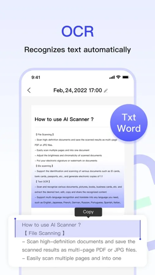 【To Text & Excel】Recognizes text automatically. Turns scans into Word, TXT, and Excel.