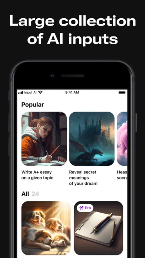 Input app is a revolutionary AI-powered creative toolbox that gives you the perfect blend of automation and creativity. Use it whatever you need: generate unique ideas in few seconds or solve routine tasks. Do a few taps and let the AI do the rest!