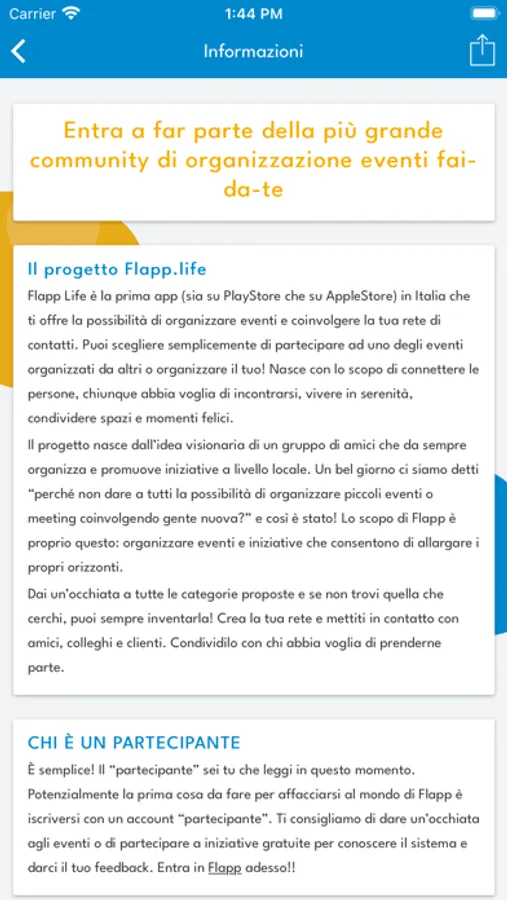 Flapp - Free Life app è la prima app in Italia che ti offre la possibilità di organizzare eventi e coinvolgere la tua rete di contatti. Puoi scegliere semplicemente di partecipare ad uno degli eventi organizzati da altri o organizzare il tuo! Nasce con lo scopo di connettere le persone, chiunque abbia voglia di incontrarsi, vivere in serenità, condividere spazi e momenti felici. Il progetto nasce dall’idea visionaria di un gruppo di amici che da sempre organizza e promuove iniziative a livello locale. Un bel giorno ci siamo detti “perché non dare a tutti la possibilità di organizzare piccoli eventi o meeting coinvolgendo gente nuova?” e così è stato! Lo scopo di Flapp è proprio questo: organizzare eventi e iniziative che consentono di allargare i propri orizzonti. Dai un’occhiata a tutte le categorie proposte e se non trovi quella che cerchi, puoi sempre inventarla! Crea la tua rete e mettiti in contatto con amici, colleghi e clienti.