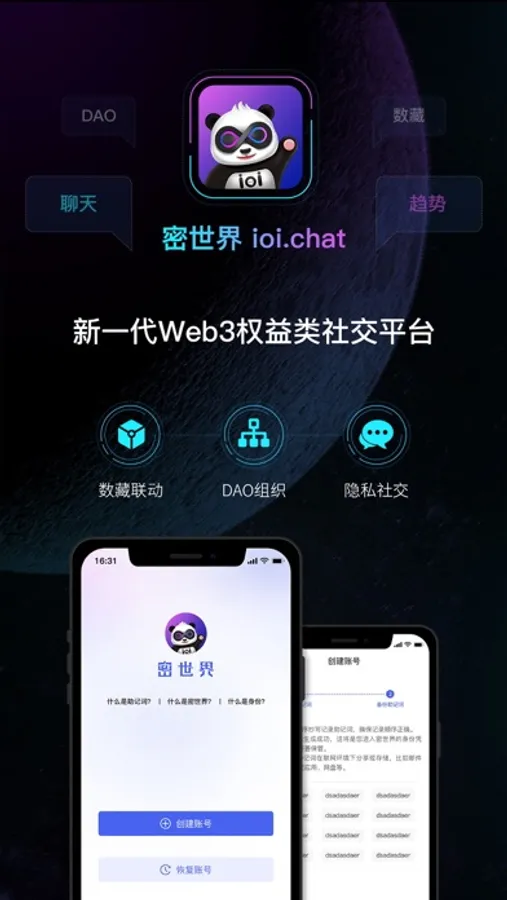 密世界是基于区块链(联盟链或公链)技术, 借助于区块链的去中心化特性,各类节点可分布式独立部署于网络中,通过区块链智能合约形成整合的去中心化安全通信系统。是首款与数藏平台联动,赋予数字藏品实际使用意义的社交类软件。用户通过在密世界中输入已对接数藏平台的授权码,即可在密世界中展示出可被设置为头像、壁纸、靓号、表情包的数字藏品,并可在聊天、添加好友、头像设置等功能中实际使用。也可在“趋势”模块中对已接入数藏平台的藏品市值进行查看和持续关注,也可在“DAO”模块中创建、加入不同的DAO社群,与其他用户进行交互,给用户提供便捷、具有适用性的区块链交流社群平台。