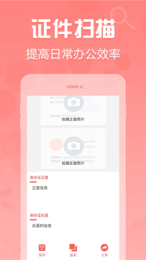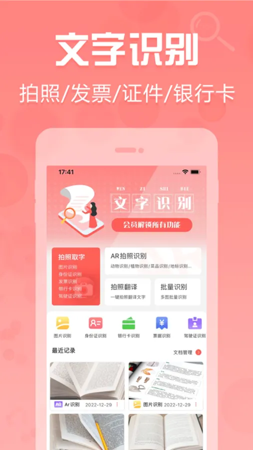 • 文字扫描,快速识别图片/文档/PDF/身份证/银行卡/名片等;