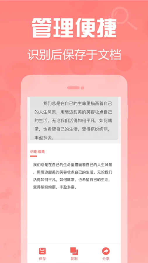 • 拍照取字,手机拍纸质文档,智能去除杂乱背景;