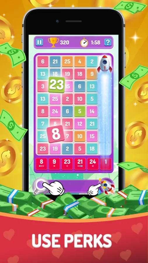 Once activated, the blasters blow away some pieces from the board, helping you to find the target numbers faster. You are equipped with the Standard Blaster (which blasts 5 pieces), however you can upgrade to Mega Blaster or Atomic Blaster, which blast 7, respectively 9 pieces. Each blaster consumes Gold Bars, which you can gain back by increasing your level or by earning achievements.