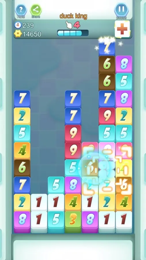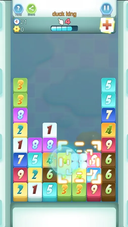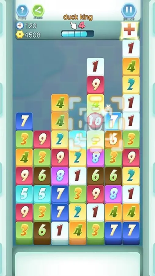 2: You can drag a number onto another adjacent number. If the two numbers overlap and add up to less than 10, the number will be synthesized by adding two numbers. For example, dragging 1 to 2 will form 3; if there are 3s adjacent to the formed 3, the adjacent 3 will be eliminated together with the newly formed 3.