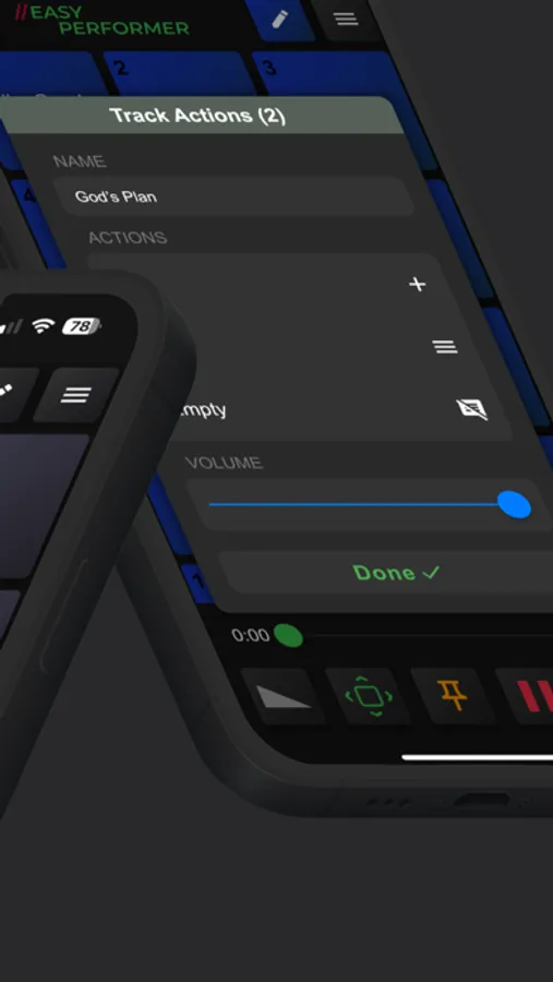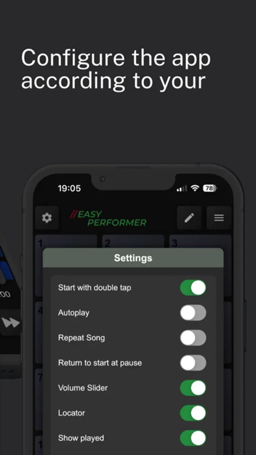 It’s possible to have a fade out during playback, and the possibility to place a locator for rehearsal to have the track start at a specific part of the song. There are much more options available for example: Auto play, repeat song, show played and much more.