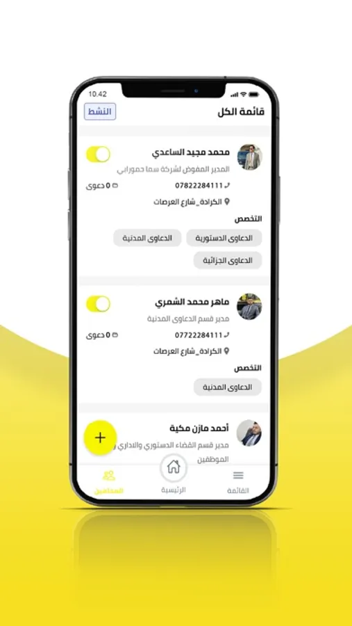 الشرعية ، المدنية ، الجزائية ، القضاء الاداري وقضاء الموظفين ، الدعاوى الدستورية الخاصة بالمحكمة الاتحادية العليا ، دعاوى قوى الامن الداخلي والدعاوى المصرفية كافة ودعاوى محكمة العمل ، تنظيم وتسجيل كافة الشركات