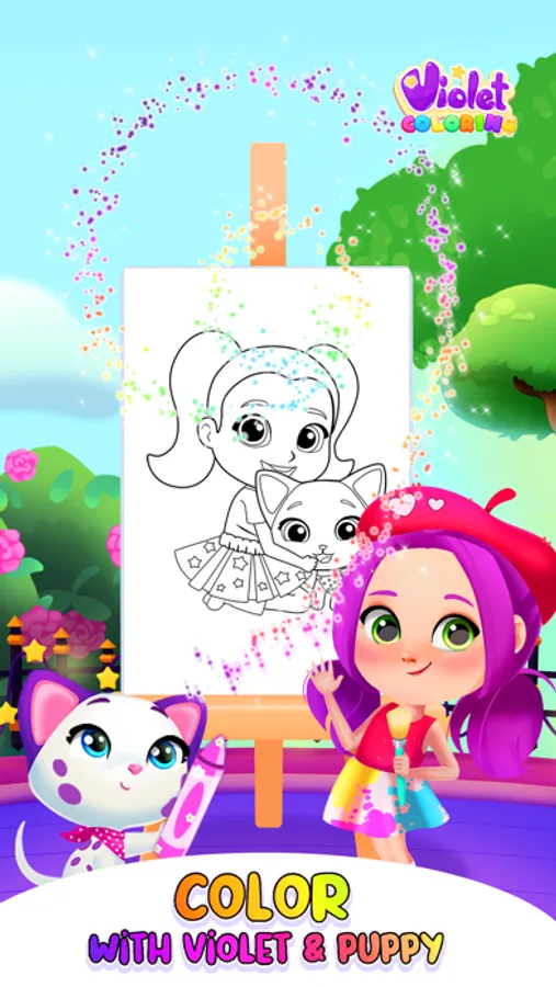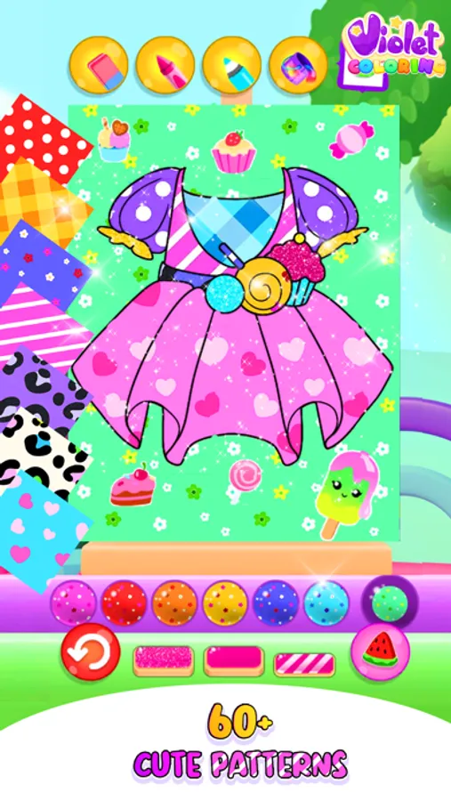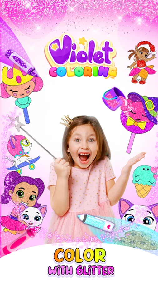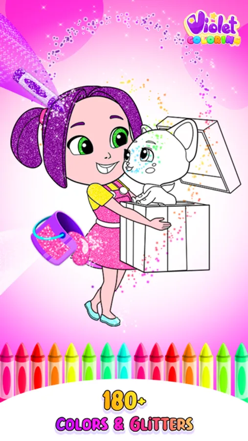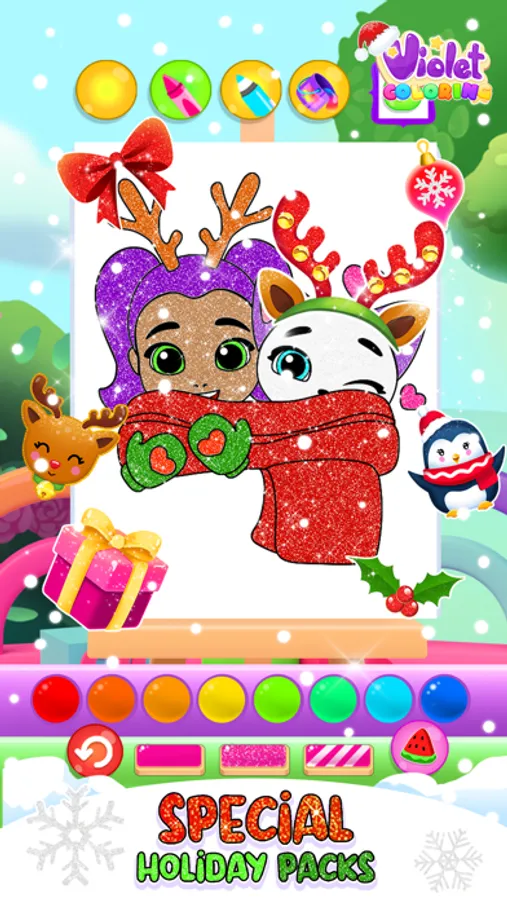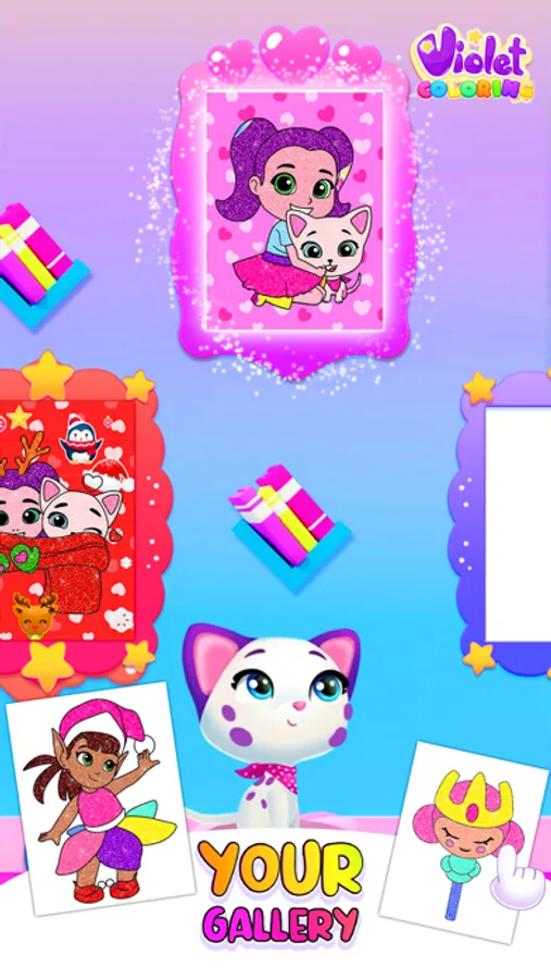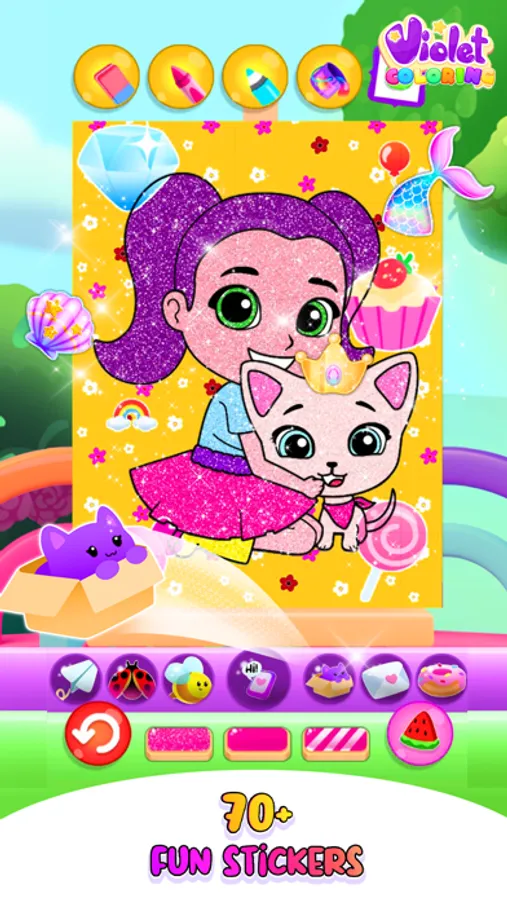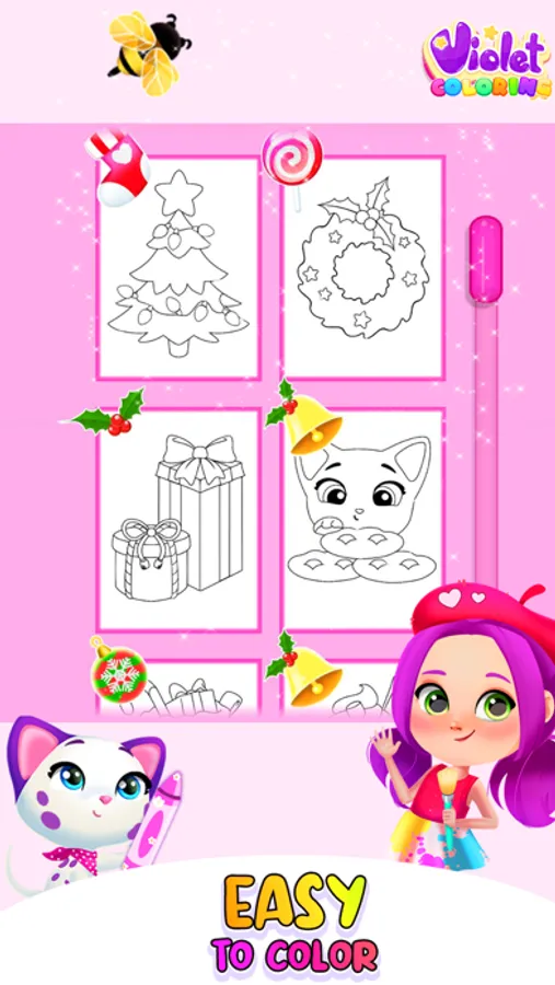 Color beautiful drawings alongside an amazing friend named Violet. You should start by picking the drawing that you like the most. We have tons of coloring pages you can choose from such as cats, delicious deserts, elves, dresses, Christmas trees, presents, pictures with Violet and her little pet and so many others. After you chose the design, you liked best, use the tools at your disposal. Select a cool pattern like stripes or polka dots or opt for a more unique look and add glitter everywhere. The sparkles come in a lot of different shades and colors so you should try all of them out before making a final decision. The background is so plain and boring right now: paint it a vibrant color and add little details to make the drawing stand out. There are over 180 colors and glitter shades for you to pick from. Use crayons for an effortless look and if you are in the mood for something more artistic choose the paint brush. When choosing the paint observe how different tools have different strokes. The result will depend on the tools you have worked with so far. The colored pencils are also a good option because they are very pretty and easy to use. If you made a mistake do not stress about it. Just press the button located on the top left corner of the screen and tap over the area you want to erase. If your picture needs something to make it look even more special than it already does go to the sticker section of the game and attach a couple of them. There are over 70 stickers including a lady bug, a bee, a glazed donut, a paper plane and so on. Just in time for the Holiday Season we have prepared an adorable gift for you. Christmas-themed drawings that you can color and decorate to your liking. Add green, red, white and yellow for a more festive look. Do not forget to add a lot of glitter to make it look even better as it did before. After finalizing your masterpiece save it and go to your gallery. There, all of the drawings you have completed will be showed.
