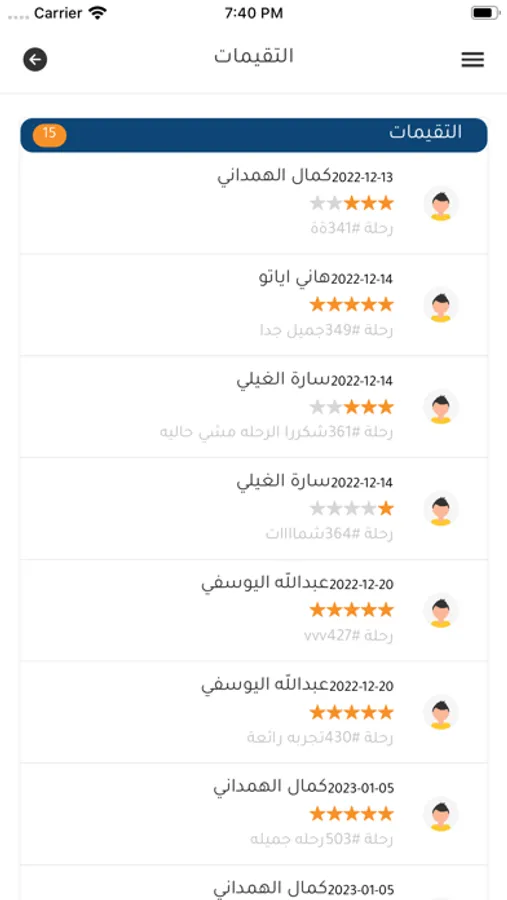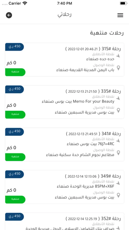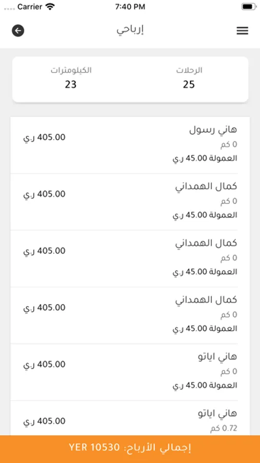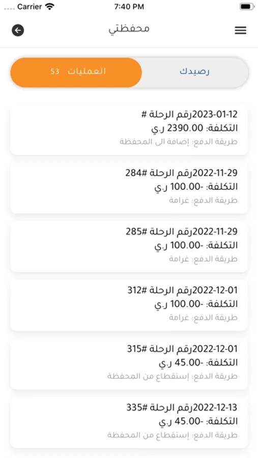 يستطيع السائق معرفة قائمة الرحلات التي نفذها وحالتها انتهت، الغيت وأيضا الأرباح وتاريخ الرحلة وكم ربح من كل رحلة وكم عليه للإدارة من كل رحلة واجمالي الربح واجمالي ما عليه لإدارة الشركة. ويستطيع السائق أيضا معرفة كيف قام الركاب بتقييمه.