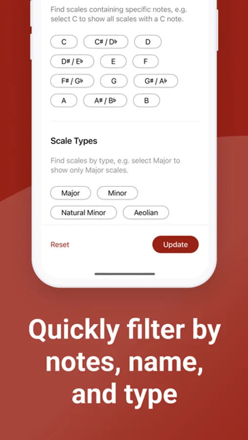 Enter a few of the notes and we'll instantly bring up all matching scales. Tap on a scale to view its notes, chords, and a fretboard visualisation.