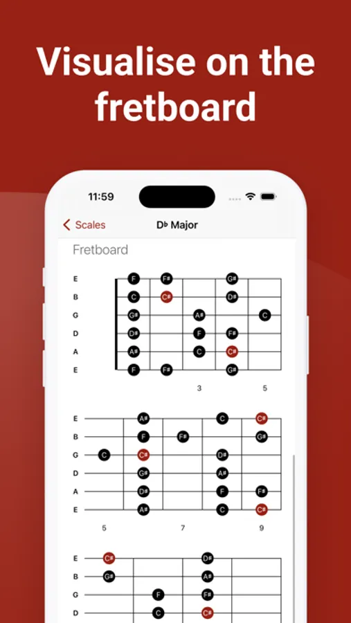 Find any scale and visualise its notes on a fretboard along with the chords associated with it. The ultimate guitar companion app!