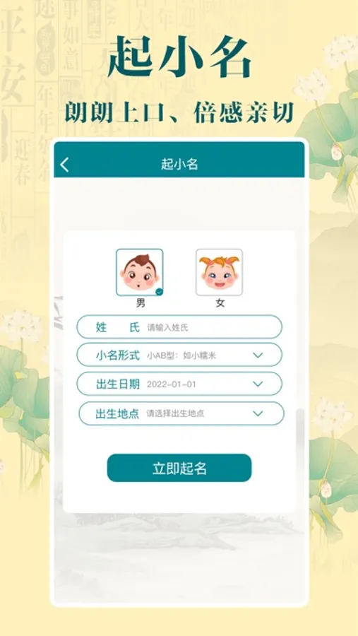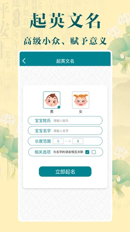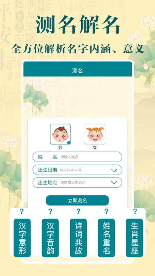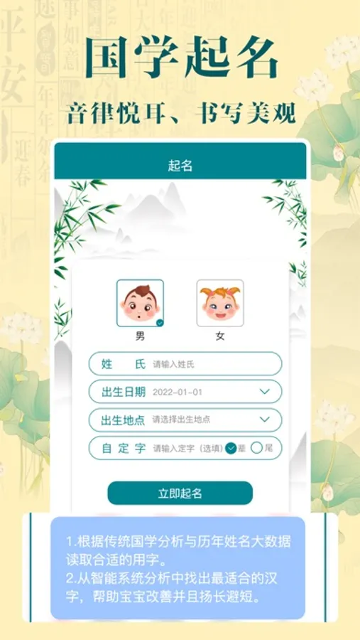诗词起名,国学经典起名, 助力宝宝起个文化内涵的好名! 我们通过中华传统诗词库,结合汉字的音律、声韵、字义、字形等,大数据筛选出符合传统审美,内涵又丰富寓意的名字。