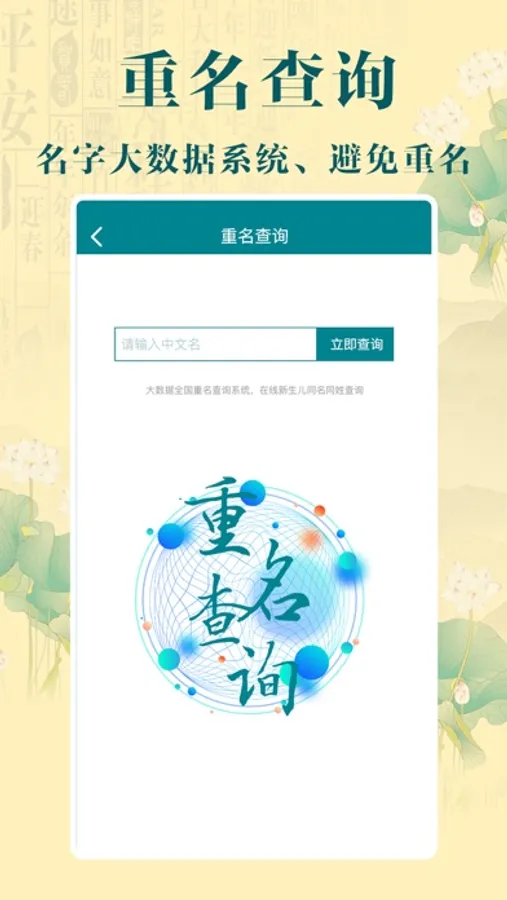 4 多种个性功能:可以给双胞胎起名,起4字名,2胎宝宝名字,单双名,叠名,英文名,重名查询,起小名乳名等。