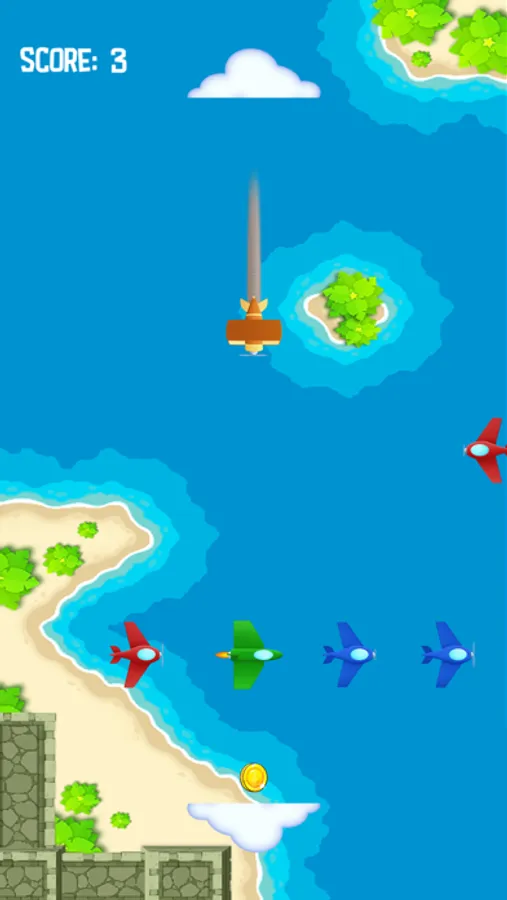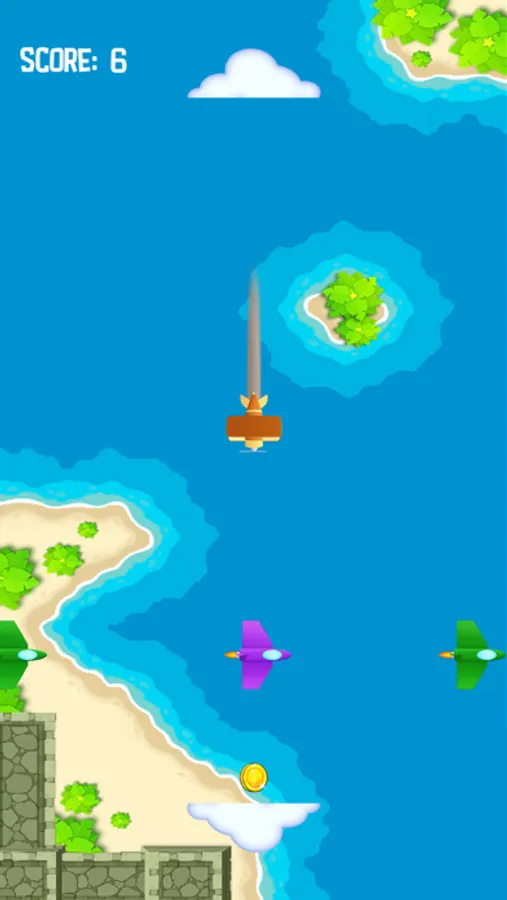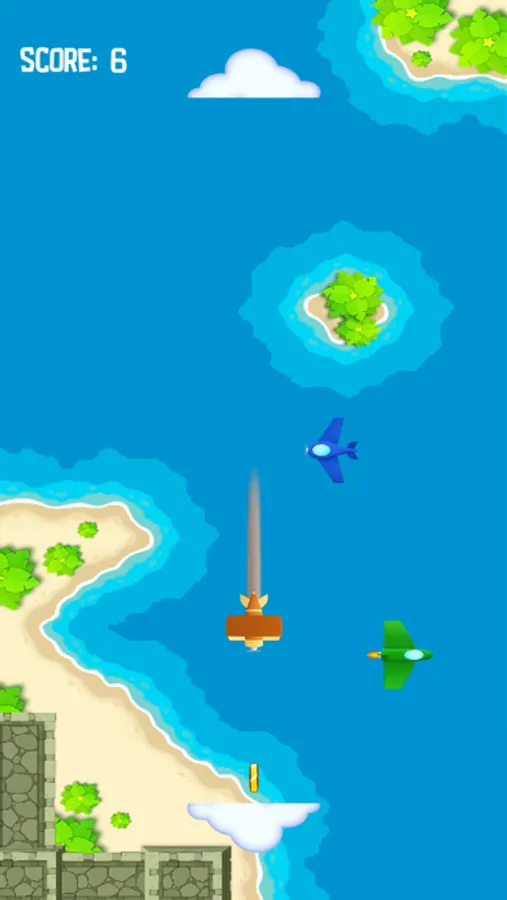 Jogo 2D com vista de cima (Top Down), onde o jogador controla um avião bi-motor e tem como objetivo desviar de aviões inimigos e coletar moedas que somam a sua pontuação, tentando assim fazer a maior pontuação possível.