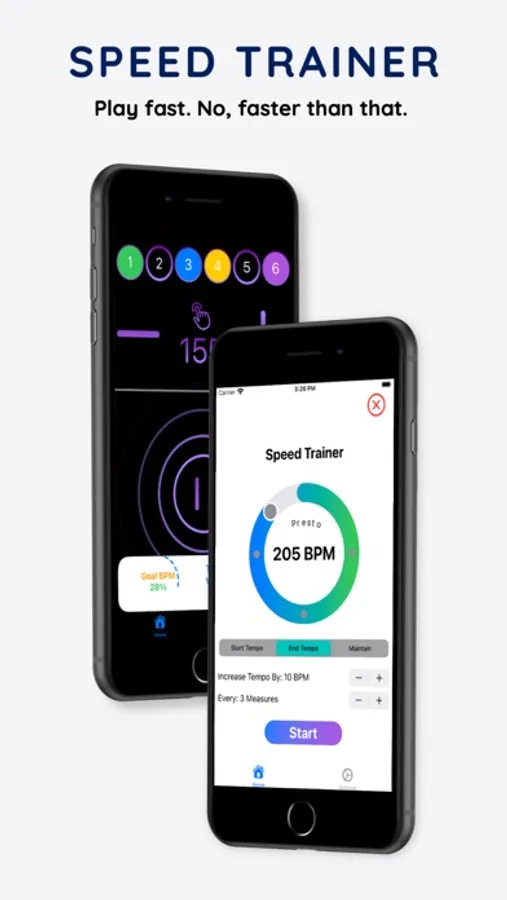 Our speed trainer - the most advanced speed trainer on the App Store - is designed to help you play your very fastest. You can select a "Start Tempo" and an "End Tempo" (your Goal BPM), as well as set how many measures of music you wish to Maintain your final tempo. You can even customize by how many BPM you wish to increase the Tempo, or how many measures you wish to play in between each increase. Once you launch the Speed Trainer, a pop-up on the bottom allows you to keep track of your progress, both in reaching your Goal BPM and in finishing the entire training session.