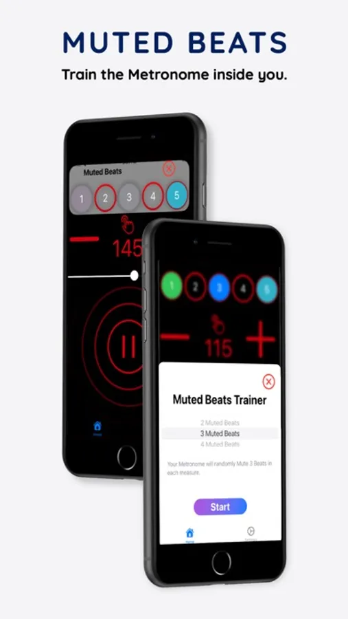Train your internal Metronome with the Muted Beats Trainer. You can select how many beats you wish to be Muted in a measure, and then the Muted Beats Trainer will randomly mute that number of beats, changing which beats are muted with each new measure.