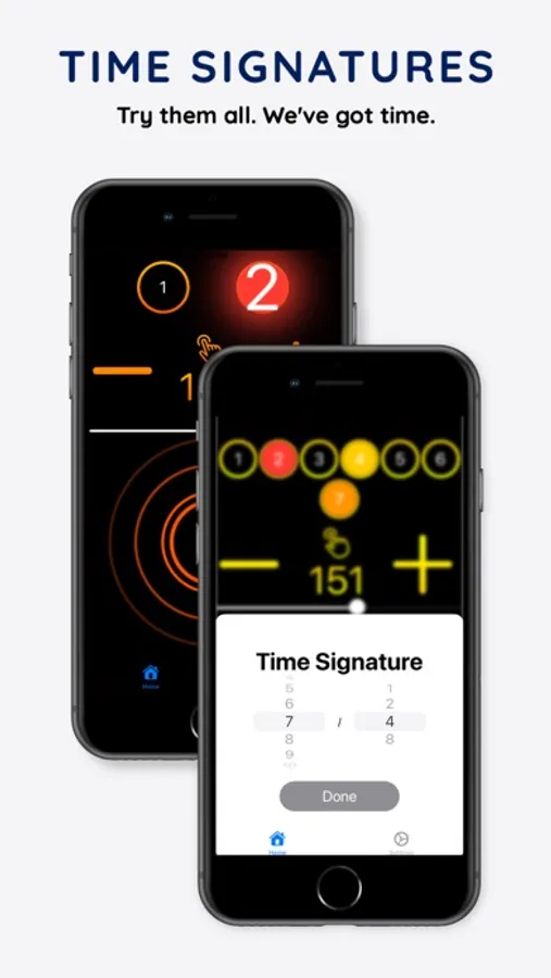Select your Time Signature, and then tap the Beat Circles at the top of the screen to Accent a Beat. The Accented Beat will fill in with a unique color, and will play with a different sound (which you can choose in Settings).
