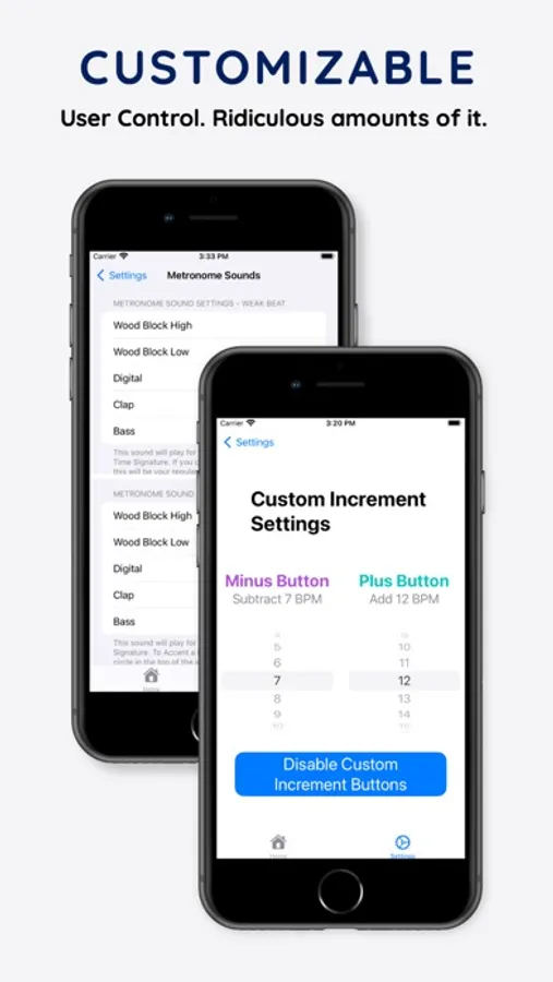 The Settings Tab offers exceptional customization for your Metronome. Turn the Animations on/off, choose from 7 stylish Theme Colors (Blue/Red/Green/Yellow/Pink/Purple/Orange), and change your Metronome's Sound for both Strong and Weak Beats. With a Pro Subscription, you can also turn on Taptic Pulse, so you can feel the rhythm as well as hear it; in addition, you can configure your Custom Increment Buttons, which enable you to increment the BPM by an amount you choose when you long-press the "Plus" or "Minus" buttons.