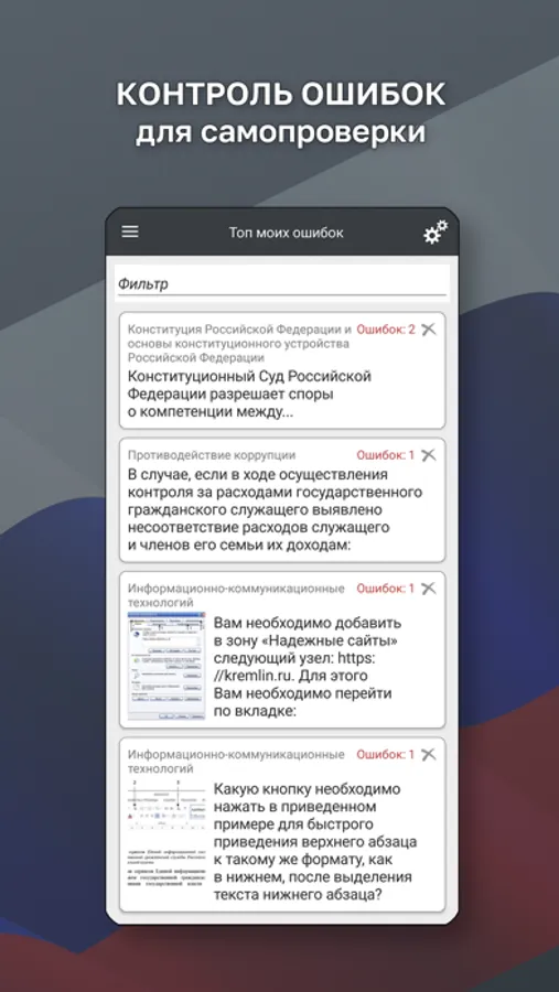 - Билеты Госслужбы по всем темам с разъяснениями: Русский язык, Конституция, Госслужба, Противодействие коррупции, Информационные технологии
