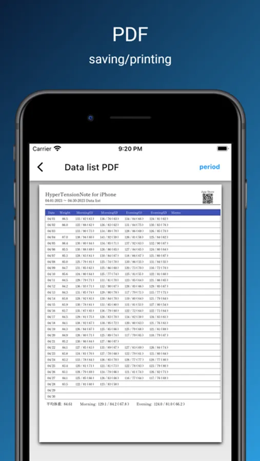 ・Data list PDF (morning and night blood pressure, weight, memo)