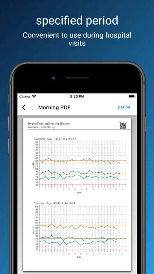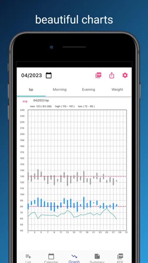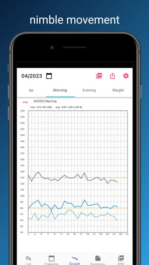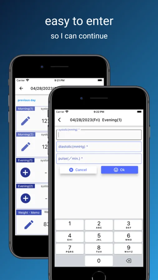 You can enter your blood pressure and pulse twice each morning/night, your weight, and a memo of up to 100 characters every day. A list of measured values and various graphs can be saved as a PDF file and printed.
