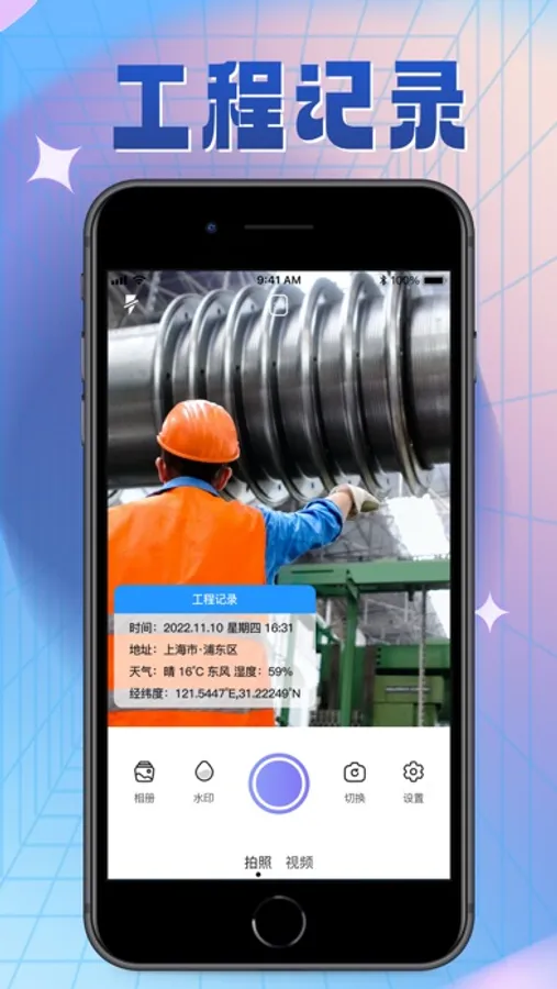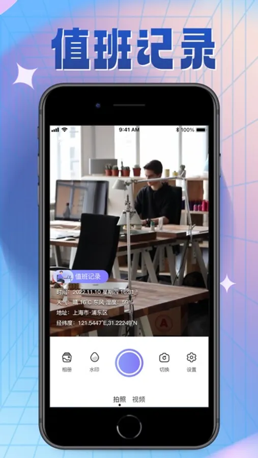 工作水印:工作拍照、团队考勤打卡、工程管理、外勤拍照、时间定位准确,防篡改,图片真实认证。