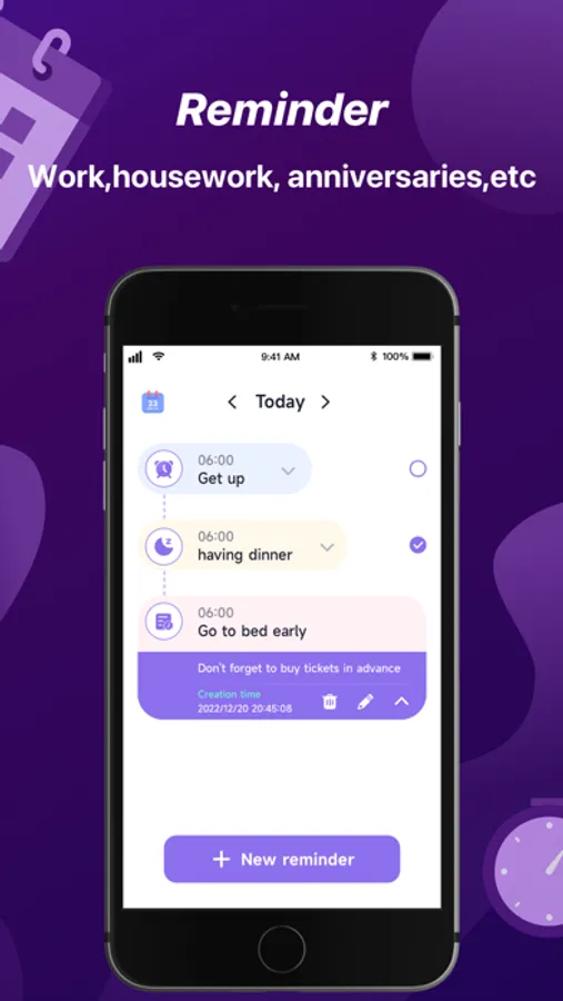 • Timeline reminder event list, intuitive and easy to view.