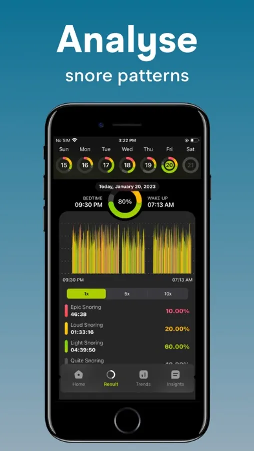 Based on the readings and analysis chart, Snore Tracker gives you a detailed insight into the type of snorer you are – light, heavy, etc.
