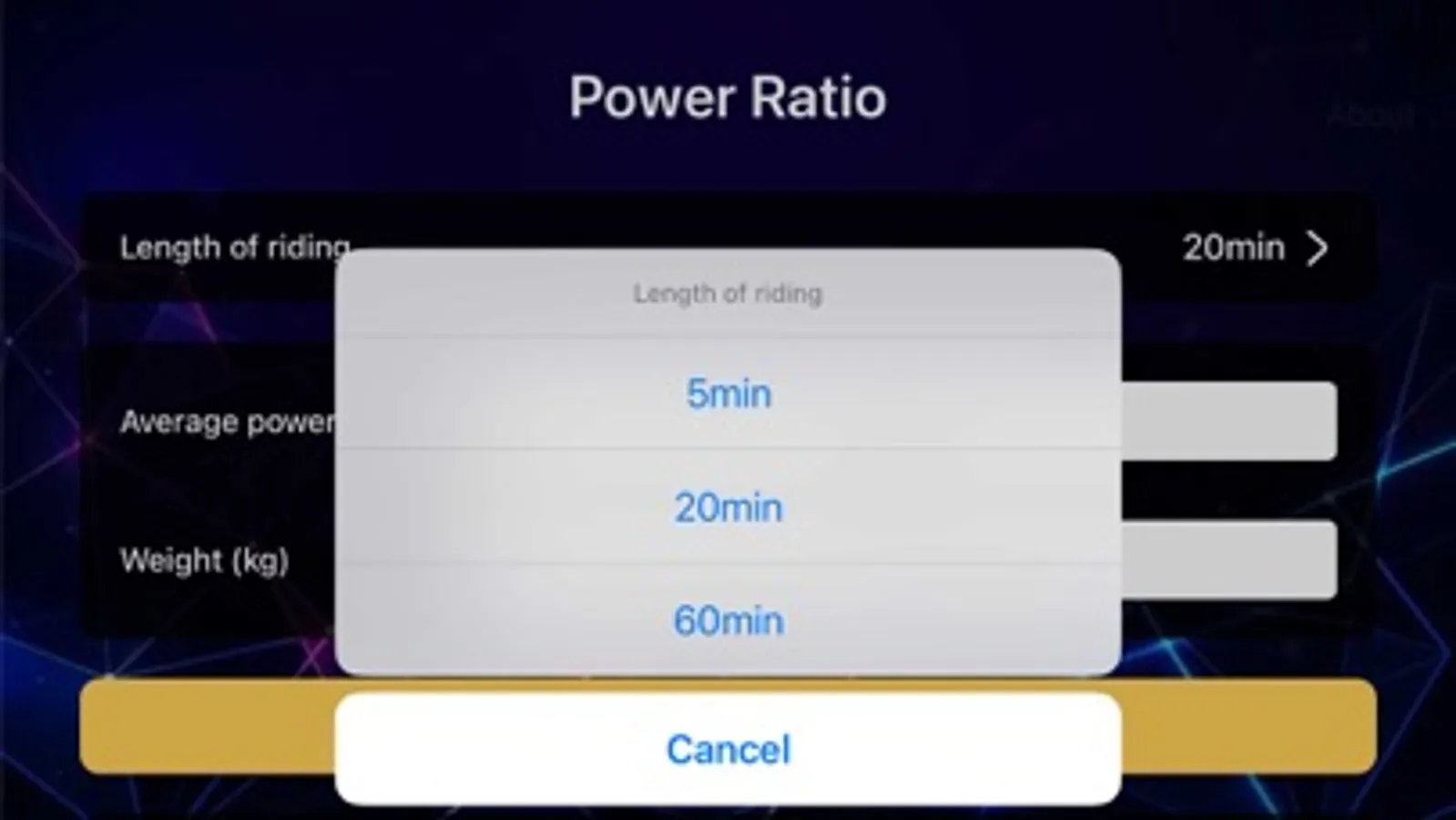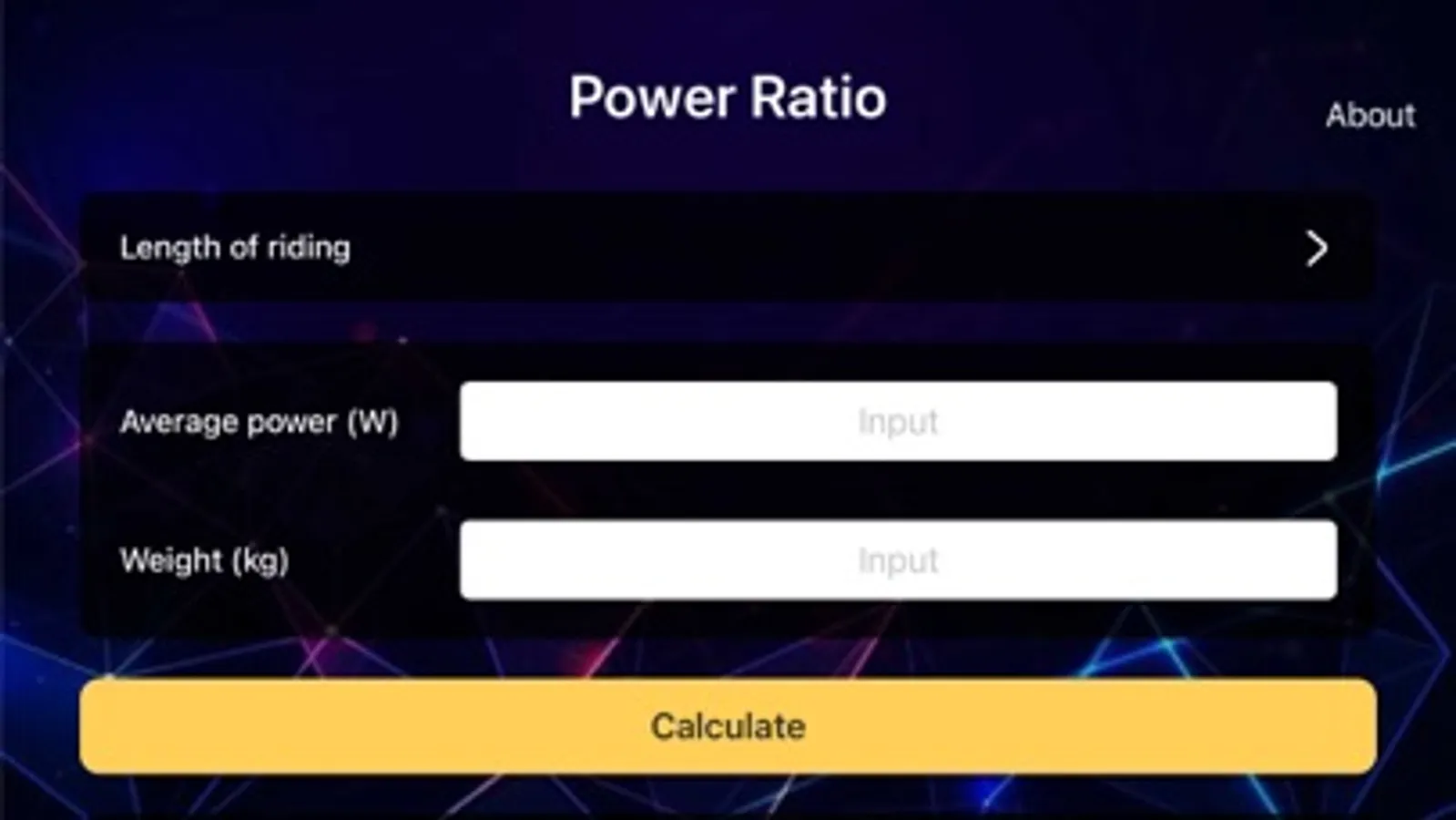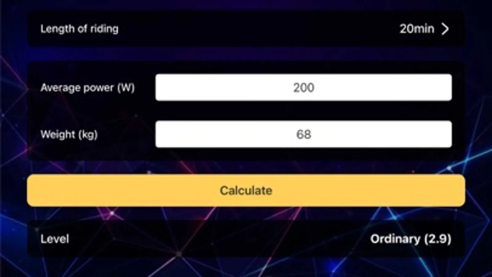 This application is used to calculate the power weight ratio in cycling and evaluate the user's riding level according to the calculation results. The power weight ratio is one of the key indicators to determine the uphill speed of cyclists. The total power output generated by riding plays an important role in determining the overall riding.