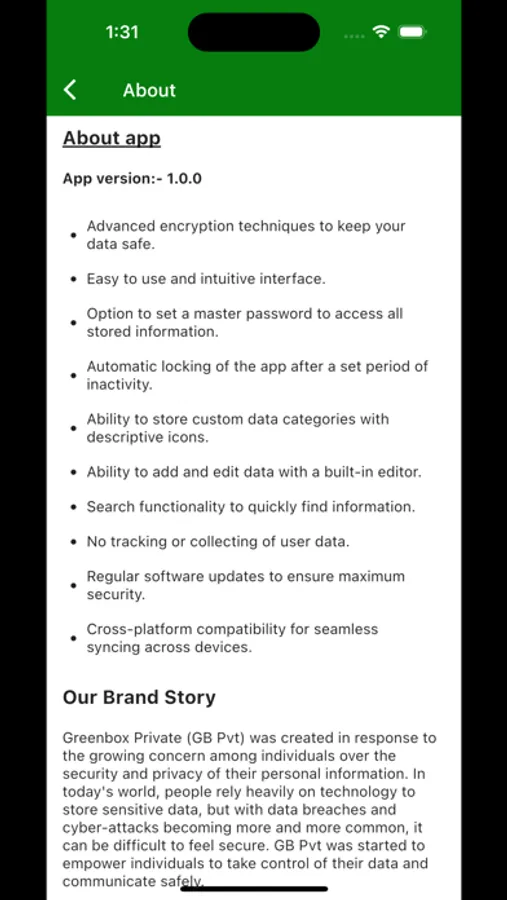 Greenbox Private also offers a range of advanced security features. Our app uses AES-256 encryption to protect your data. This encryption standard is used by governments and militaries around the world to protect their data.