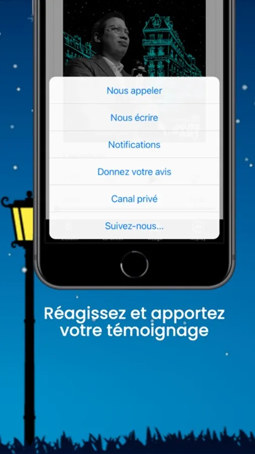 - Réagir : pour m’appeler, m’envoyer un message, me suivre sur les réseaux sociaux ou activer les notifications.