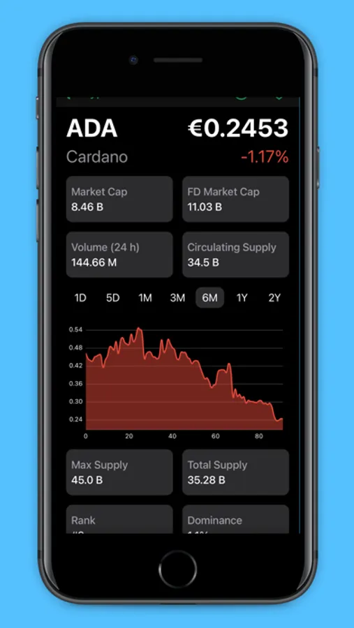 Coin Track Master is a free market tracker for crypto currencies and stocks. Enjoy keeping track of all your favourite crypto currencies and stocks in real-time and analyse data such as market cap, FD market cap, market dominance... for crypto currencies and dividend yield, P/E, 52 week averages... for stocks. Bookmark all your relevant coins for convenience and track their prices in 20 different fiat currencies. Track historical data for assets in charts.