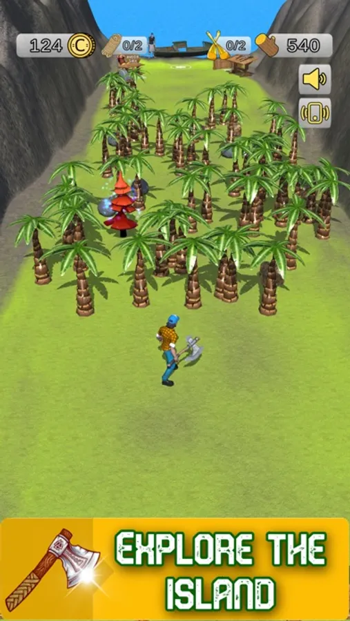 Help Leo escape the island. Repair the boat with the wood you cut. You can use special axes to cut wood faster. Or you can sharpen your axe and harvest wood faster.