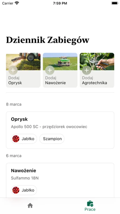 Utwórz rozkład własnego gospodarstwa. W prosty sposób dodawaj wykonane zabiegi, nawożenie, prace w sadzie. Wybieraj z aktualnej listy środków ochrony roślin oraz nawozów. Oznacz warunki atmosferyczne w trakcie zabiegów.